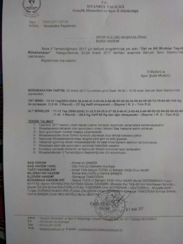 İSTANBUL BOKS İL TEMSİLCİLİĞİ DUYURUSUDUR 4 Aralık 2017 İstanbul Minikler Teşvik Müsabakaları 23-24 Aralık 2017 Yılın son Müsabakaları. Kulüp lerimize hayırlı olsun Tweet Sayfayı Yazdır